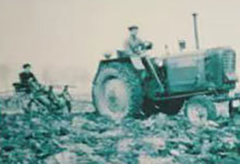 1958年制成我國第一批國產(chǎn)輪式馬力拖拉機。。圖為當時生產(chǎn)的40型拖拉機在工作