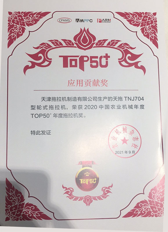 2021年天津拖拉機制造有限公司生產(chǎn)的天拖TNJ704型輪式拖拉機,榮獲2020中國農(nóng)業(yè)機械年度TOP50*年度拖拉機獎。